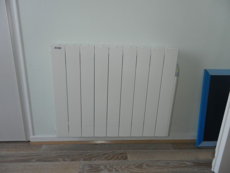 Travaux de remplacement par l'electricien des anciens convecteurs electriques par des radiateurs chaleur douce a inertie Acova plus economiques dans un appartement renove en chauffage et electricite
